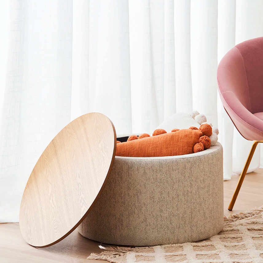 12 - 14 WeeksBarney with a removable lid and faux linen upholstery. It offers concealed storage space and features anti-slip plastic pads on the lid and base for stability.