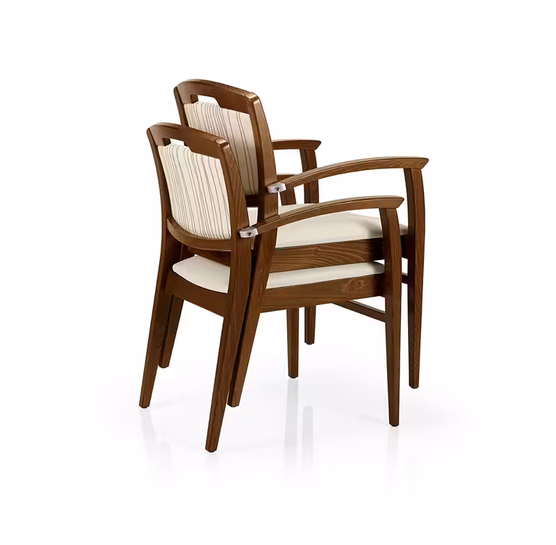 - Upholstered seat and back with high density foam and a stackable European beech timber frame.